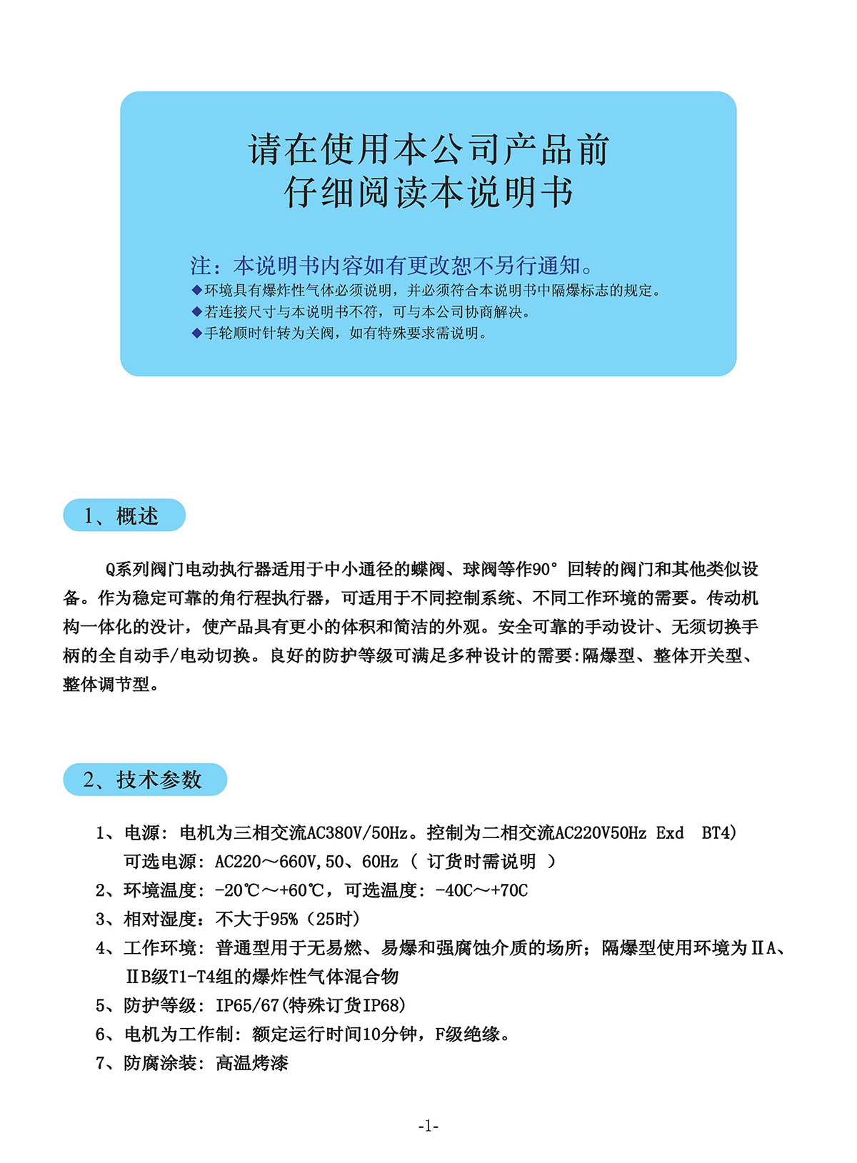 Q系列閥門電動(dòng)執(zhí)行器適用于中小通徑的蝶閥、球閥等作90°回轉(zhuǎn)的閥門和其他類似設(shè)備。作為穩(wěn)定可靠的角行程執(zhí)行器,可適用于不同控制系統(tǒng)、不同工作環(huán)境的需要。傳動(dòng)機(jī)構(gòu)一體化的設(shè)計(jì),使產(chǎn)品具有更小的體積和簡潔的外觀。安全可靠的手動(dòng)設(shè)計(jì)、無須切換手柄的全自動(dòng)手/電動(dòng)切換。良好的防護(hù)等級(jí)可滿足多種設(shè)計(jì)的需要:隔爆型、整體開關(guān)型、整體調(diào)節(jié)型。